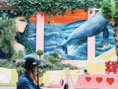 四川观察初秋的德阳,暑气渐消,微风正好。 市区绵远街老巷深处,一束阳光斜斜打在斑驳的砖墙上,却被一抹灵动的蓝色截断——一头壮硕的蓝鲸正从墙里“破浪而出”,水花激荡间,少女发间的藤蔓似在微风中轻颤。 “妈妈快看!鲸鱼要跳出来啦!”7岁的严曼伊拽着妈妈的手,小脸上满是惊叹。“这是浮雕,它把艺术的美和空间利用结合了起来!”严曼伊的妈妈是一名美术老师,选了一个凉快的下午,她们专程来绵远街打卡。 “从美术角度看,此
