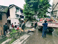 6月30日下午3点,自贡市广播电视台记者在郭街盐都山水社区看到,街道干部和社区书记带着二十多名党员和志愿者,冒着霏霏细雨,来到流经社区的金鱼河岸边,对附近居民栽种的农作物进行全面清理,大家顾不得道路湿滑,全身心投入到河岸的保洁整治行动中。党员干部们有的解绳索,有的拔根苗,不一会儿十多米长的农作物就被拆除。