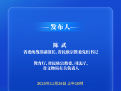 2025年11月26日(星期三)10:00,省政府新闻办将在四川新闻发布厅举行“决胜‘十四五’ 续写新篇章”系列主题新闻发布会第十五场,省委统战部副部长、省民族宗教委党组书记陈武围绕四川“十四五”时期民族宗教工作主要成就作介绍,教育厅、省民族宗教委、司法厅、省文物局有关负责人参加答记者问。四川发布客户端将全程图文直播,敬请关注! 点此进入直播