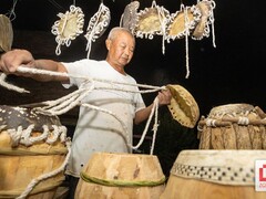 金融投资报您的浏览器不支持 video 标签。 视频/张熠 月光如水,铺满了富顺县福善镇月形村的一座农家院落。夜深人静时,这里总会传来“蹦、蹦、蹦”的敲击声——沉稳、绵长,像是从大地深处传来的心跳。一盏暖黄色的灯,照亮了堆满木料、牛皮与各式工具的工作间。72岁的刘衍清就俯身其间,手握木槌,一点一点地加固鼓身。他眼神专注,手上的动作细腻而坚定。檐下竹竿上,晾着一张张初具形态的牛皮鼓面,散发着淡淡的皮脂气味;身