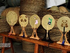 眉山市融媒体中心12月24日上午,记者走进黄市草编非遗工坊灰墙泥瓦的平房时,轰隆隆的压帽机声正与指尖翻飞的编织声交织成曲。68岁的陈德书正手把手教几位从邻镇赶来的学员:“你看,这个地方要用‘捡二压二’的技法,挑两根、压两根,一圈圈往外延……”她是自贡市黄市草编第三代传承人,也是第四代传承人郭桃的母亲。 而几步之遥的直播间,郭桃正举着一把草编扇,对着手机镜头笑道:“这个是灯芯草编的,时髦吧?我们注册了‘黄市’‘菁扇