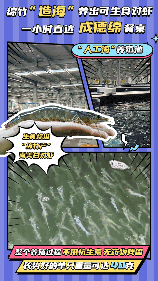 不用等海运 不用盼远途 成德绵吃货在家门口 就能吃上新鲜海虾了! 就在德阳绵竹玉泉镇 一个总投资5亿元的高科技养殖项目 把“海洋”搬进了内陆 还养出了能生食的南美白对虾 目前 项目二期首批鲜虾将在12月大量上市 成德绵地区 新鲜海味1小时就能直达餐桌 …… 您的浏览器不支持 video 标签。 位于绵竹市玉泉镇的南美白对虾数字化养殖项目,彻底颠覆了传统水产养殖模式。该项目通过与中科院海洋研究所