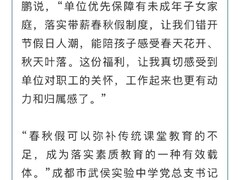 资阳融媒体中心为深化校家社协同育人促进学生身心健康全面发展 近日 四川省教育厅等十一部门 联合印发通知 在全省实施中小学春秋假制度 这意味着 中小学春秋假在四川实现落地