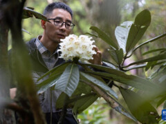 人民日报近日,人工培育了29年的珍贵高山杜鹃——凸尖杜鹃,在位于四川省成都市都江堰龙池国家森林公园里的华西亚高山植物园首次开花。 据华西亚高山植物园科研人员介绍,凸尖杜鹃是杜鹃花中叶片最长的种类,自然分布于云南、西藏高海拔原始林区,人工繁育周期长、难度大。目前开花的这株凸尖杜鹃长势良好,花序硕大,有花28朵,花冠呈乳黄色。 据园区引种记录,这批凸尖杜鹃的种子于1997年10月采自云南省丽江市海拔3000米