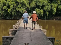 广元市融媒体中心10月15日午后,秋日暖阳洒向龙溪河水面,缓缓投在永济桥的条石上。70岁的崔明兴正牵着68岁的唐德群踏上桥面——儿子刚打来电话,要母亲去杨九家里一趟。上桥前,崔明兴还是老样子,先往前跨一大步,再转身稳稳攥住老伴的手。身后的狗摇着尾巴,快跑几步跟了上来。 “慢些走哟!”路过的村民随口提醒,老两口笑着点头回应。这桥,他们已走了几十年,早走成了生活的一部分——在家门口坐车要15元,过桥再坐只要5元。省下