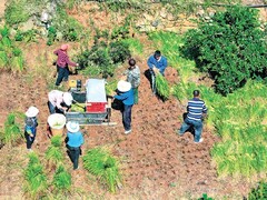 10月13日,贡嘎南麓、大渡河畔,金灿灿的阳光下,经过5个多月的孕育,石棉县王岗坪粮油现代农业园区栽种的节水抗旱稻迎来丰收。 收割机的轰鸣声响彻园区,住在河对岸的张银珍,和几位老姐妹闻声而来:“我盯了它几个月了,就想等稻子收了后,再买点米。” 让张银珍觉得“稀奇”的,是这片稻子直接撒种,全程没有“泡”过水,还挺过了8月的高温天气,稻穗竟也长得饱满。 “这叫节水抗旱稻,我们四川自己选育的。”一个声音