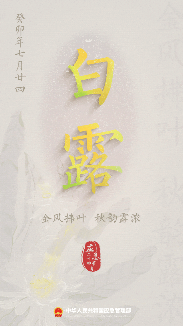 白露 是“二十四节气”中的第15个节气 秋季第3个节气 是反映自然界寒气增长的重要节气 由于冷空气转守为攻 白昼有阳光尚热 但傍晚后气温便很快下降 昼夜温差逐渐拉大 白露过后,夏热基本结束 大风天气开始频繁 天干物燥,火险等级逐渐升高 如何防范火灾发生?1. 及时清理室内、楼道可燃杂物; 2. 定期检查家用电器、电气线路、厨房燃气相关设备是否安全; 3. 电动车禁止在楼道、室内充电; 4. 时刻
