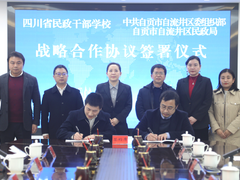 “坚持以合作共赢为宗旨,共建创新基地,加强创新交流,转化创新成果,共创社会治理新样本、新典范......"。近日,四川省民政干部学校与自贡市自流井区委组织部战略合作协议签署仪式在自流井区政府举行。自流井区是全省唯一与该校签订合作协议的区县。四川省民政干部学校党总支书记、校长兰田,自流井区委副书记、区政府区长万春霞等校地领导出席会议。 会上,四川省民政干部学校党总支书记、校长兰田与自流井区委常委、