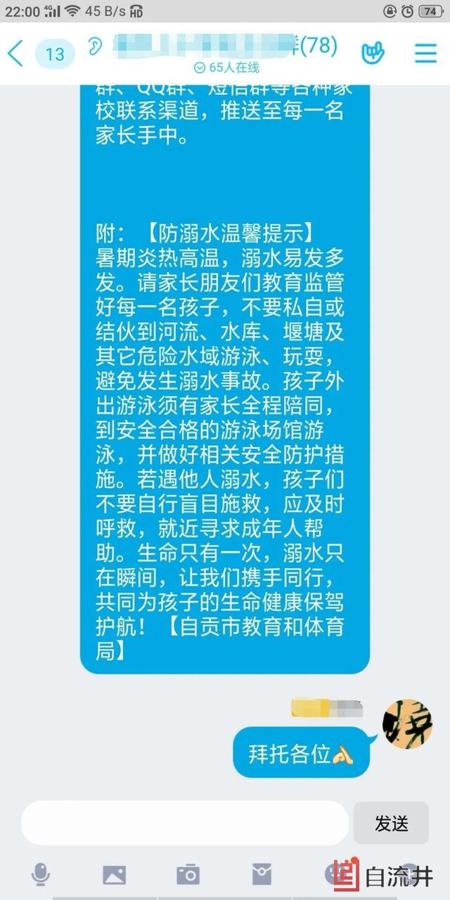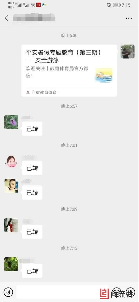特别是重点加强防溺水安全教育,学校督促各班主任每天通过家长微信群、QQ群、电话、短信等家校联系渠道常态化提醒家长履行好学生假期安全监管责任,掌握学生每天去向,严防学生私自或接伙到河湖堰塘等危险水域游泳或玩耍。对于农村留守学生等重点群体,做到“点对点”对家长进行提示,保持家校联系畅通。