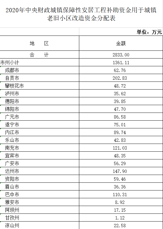 近日,四川省财政厅下达了2020年中央财政城镇保障性安居工程用于城镇老旧小区改造补助资金。