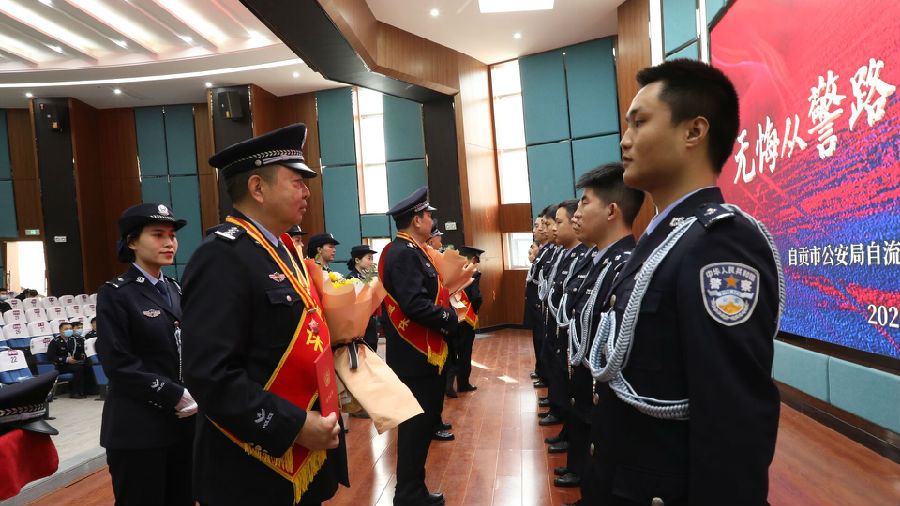自流井区副区长、分局党委书记、局长邱宏国致辞,回顾过去,一代又一代的老民警们把青春的鲜红融入深邃的藏蓝,把满腔的赤诚化作对公安事业的孜孜追求,用忠诚、奉献、担当续写着自流井公安的豪迈诗篇。一生努力、一生奉献、一生坚守,历史不会忘记,分局党委不会忘记,全局干警不会忘记,辖区群众不会忘记。展望未来,希望新入职的民警尽快适应环境、转换角色、笃定前行、扎实工作,把责任扛在肩上,把群众放在心间,坚定入警初心、直面风险挑战、勇于担当作为,沿着老一辈自流井公安人的足迹,把光荣之路走下去,旗帜鲜明讲政治,增强“四个意识”、坚定“四个自信”、做到“两个维护”,不辱使命,不负韶华,用青春和热血奋力谱写自流井公安新的华章!