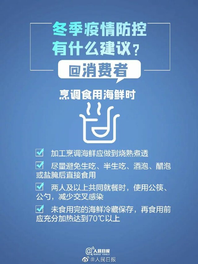 保持良好饮食习惯,倡导公筷公勺和分餐进食;避免多人聚餐,尽量缩短就餐时间;就餐时尽量同向就座,面对面就座时建议错位就座,注意保持适当距离。要选择安全放心食材,生熟食材分开存放。在处理海鲜产品尤其是冰冻海鲜产品时,应尽量佩戴手套,并防止处理过程刺破手套。食物烧熟煮透,不吃生冷食物,拒绝食用野生动物,避免发生食源性疾病和食品安全事件的风险。