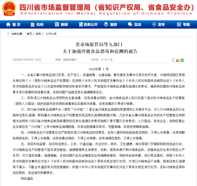 12月9日,四川省市场监督管理局等九部门发布关于加强冷链食品消毒和追溯的通告。