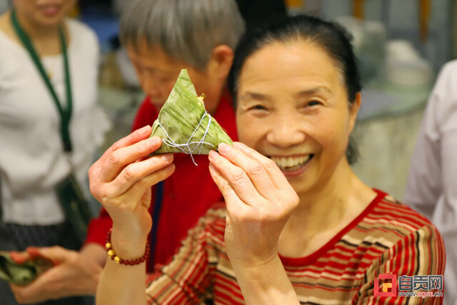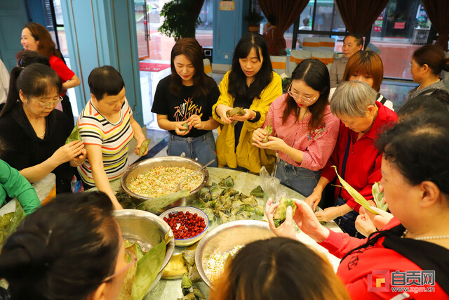 “把两片粽叶重叠,弯曲成一个漏斗的形状,底部先放一些糯米,中间放一颗蜜枣,再放些糯米填满,用手捏紧,再将上面的粽叶向下压住开口处。”在社区工作人员的悉心指导下,大家拿起粽叶、舀糯米、放红枣,争先恐后地包起粽子来,浓浓的节日气氛拉近了人与人之间的距离。