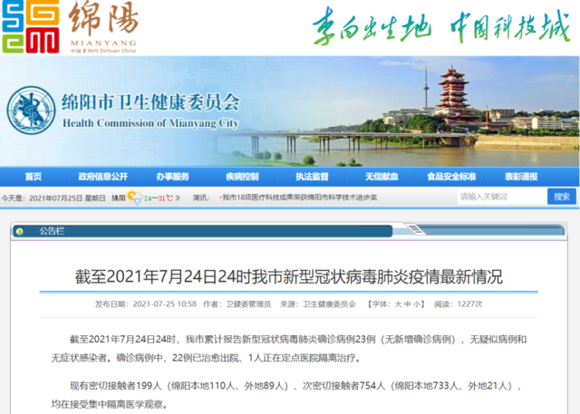 据绵阳市卫健委7月25日10时58分发布通报:截至2021年7月24日24时,绵阳市累计报告新型冠状病毒肺炎确诊病例23例(无新增确诊病例),无疑似病例和无症状感染者。确诊病例中,22例已治愈出院、1人正在定点医院隔离治疗。