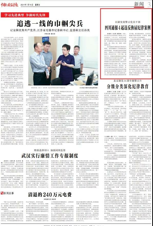 2021年7月16日,中国纪检监察报3版刊载《以新发案警示党员干部四川通报4起违反换届纪律案例》。