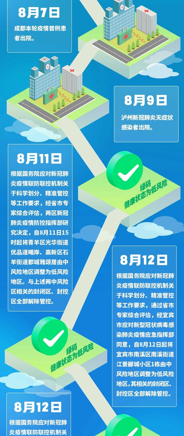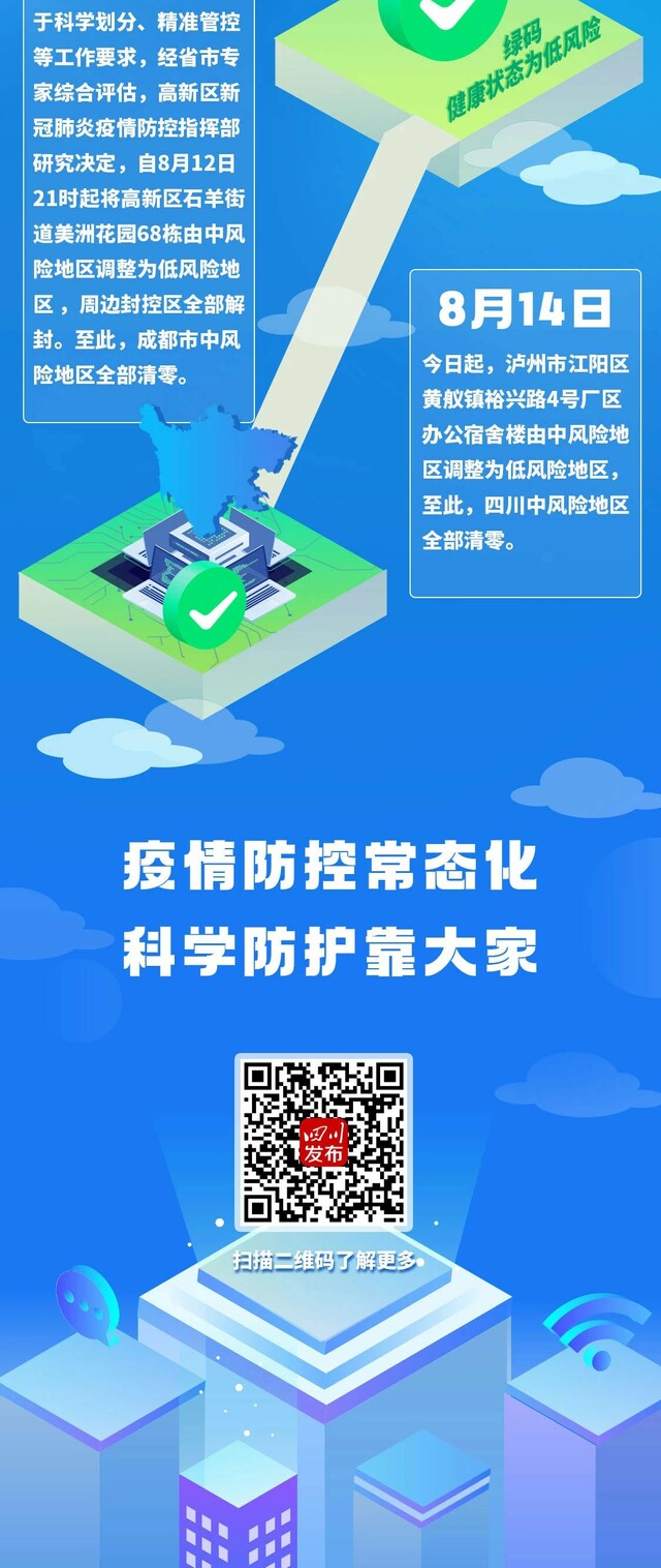 据健康四川官微消息,自8月14日0时起,泸州市江阳区黄舣镇裕兴路4号厂区办公宿舍楼由中风险地区调整为低风险地区 。至此,全省均为低风险地区。