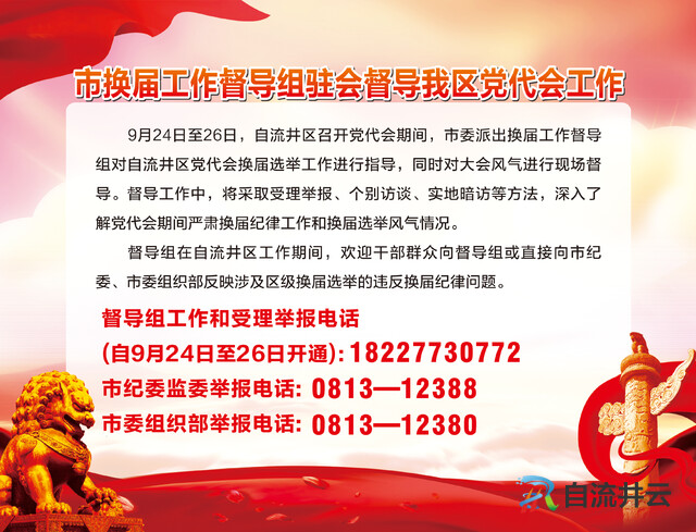 督导组在自流井区工作期间,欢迎干部群众向督导组或直接向市纪委、市委组织部反映涉及区级换届选举的违反换届纪律问题。