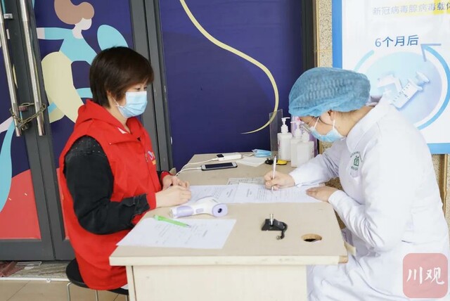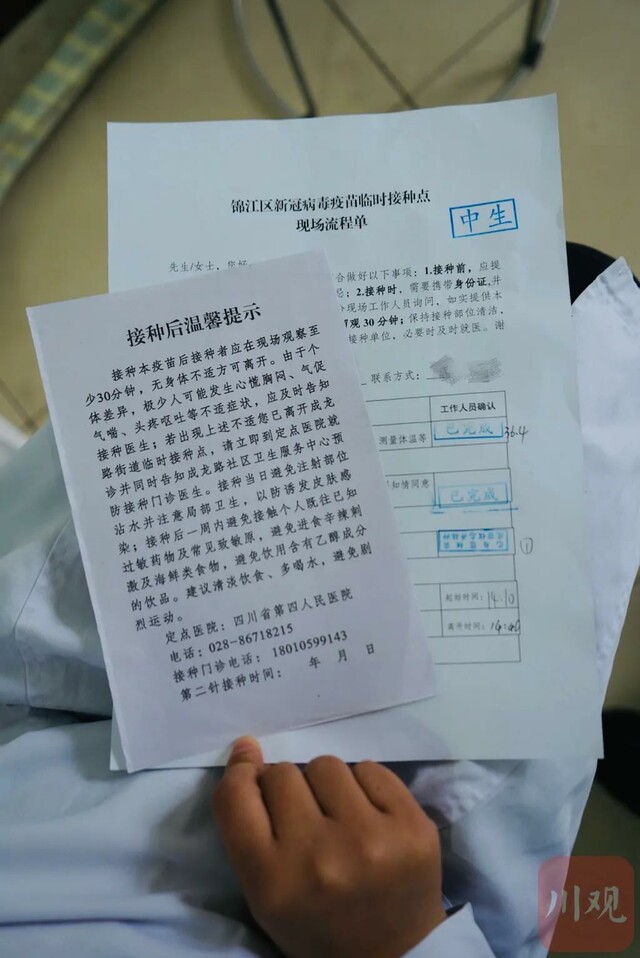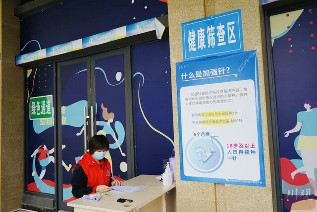 接种点的工作人员、四川友谊医院急诊科护士黄亚丽在16日一大早也打完了加强针。据黄亚丽介绍,她和医院的同事们也都在今年2月完成了两剂次的新冠疫苗接种。