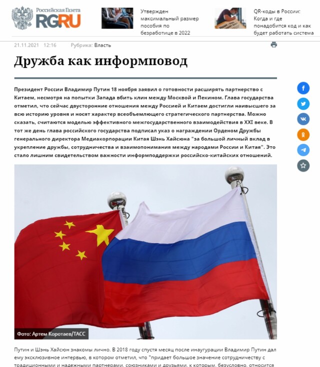 莫斯科时间11月21日,俄罗斯政府机关报《俄罗斯报》在其官方网站“政权”栏目刊发《媒体合作筑牢俄中友谊》述评。文章指出,俄罗斯总统普京11月18日在俄外交部部务会扩大会议上对俄中关系给予高度评价,强调将同中方深化国际协作,共同应对某些国家离间分化企图。同日,普京签署总统令,授予中央广播电视总台台长慎海雄“友谊勋章”,表彰其对巩固俄中人民友谊、合作,增进互相之间的了解做出的巨大贡献。这再次证明媒体合作对两国关系发展的重要意义。