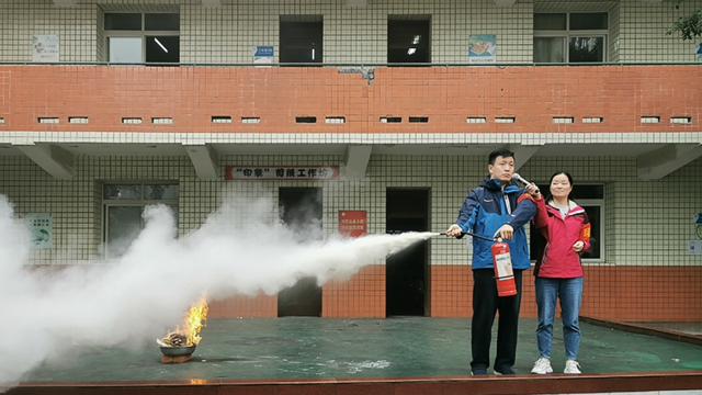 演练现场,全校近800名学生在任课教师及班主任的带领下,沿着消防应急通道进行紧急疏散。无论老师和学生,在浓烟中有条不紊的捂住口鼻,弓着腰疏散到了安全地带。演练从拉响警报到最后一名学生平安到达操场,用时3分15秒。在到达操场后,该校安办主任殷奎迅速清点了全校师生人数,对全校师生就如何正确使用消防灭火器进行了指导,并请一名学生上台进行了灭火演示。刘洋对本次演练进行了点评和总结,并针对演练中的问题再次讲解和示范,接下来再就消防应急疏散相关知识和孩子们互动。