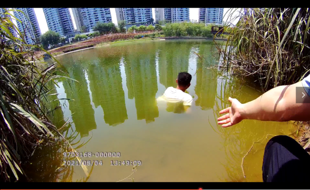 接警后,派出所值班民警根据报警人提供信息及照片上环境分析判断出,该员所说的轻生人员大致位置,副所长李泉江的带领民警李敏、陈展,辅警刘杰火速赶到相应位置分头沿河寻找。此时正是午间太阳最烈的时候,民警们不畏似火的骄阳耐心寻找,终于在河边一草丛处看到一双鞋子和一个手机,担心男子出现危险,陈展加快步伐,在前面不远处看到一名身穿白色衣服的男子在水中。此时男子距离岸边一两米,肩膀以下的部门泡在河水中,若一不小心滑到,就容易被河水淹没。因为担心自己的行为吓到男子,陈展没有立即冲上去将其拉起,而是在旁边温柔的安抚劝导,经过陈展的耐心劝导,男子终于愿意起身,陈展立即抓住男子手臂,将其拉到岸上。