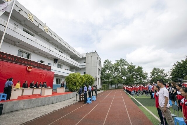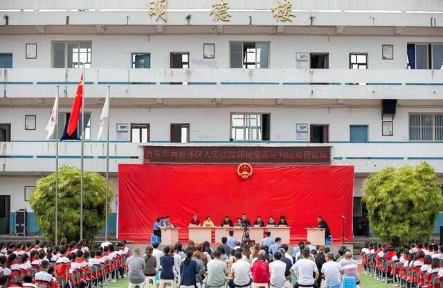 “现在开庭!”随着法槌落下,一场在自贡市德铭中学操场举行的巡回审判庭审拉开帷幕。