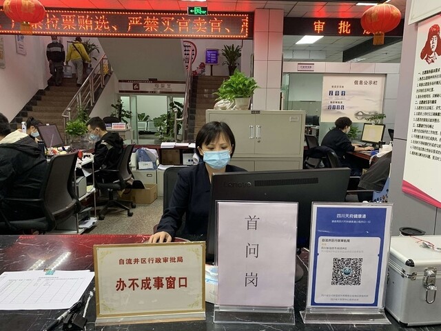 10月21日上午,在自流井区政务服务中心大厅,前来办事的群众络绎不绝。自今年起,一楼的服务台上多了一块牌子,上面醒目地写着:首问岗。“首问专员”们不断地接受群众咨询、查看各项手续和资料、引导群众到具体办理窗口,给前来办事的群众提供了极大便利,全程很给力又温馨。