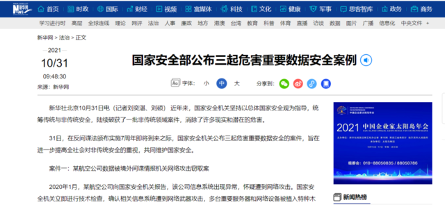 数据安全关乎国家安全和公共利益,是非传统安全的重要方面。国家安全机关提醒社会公众,如发现危害国家安全的可疑情况,请立即拨打国家安全机关举报受理电话12339,或登录国家安全机关举报受理平台进行举报。