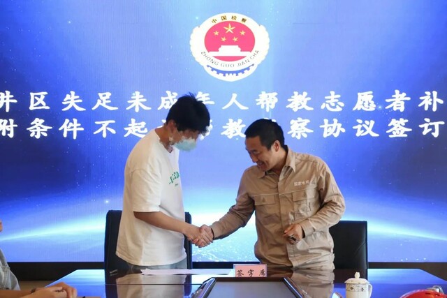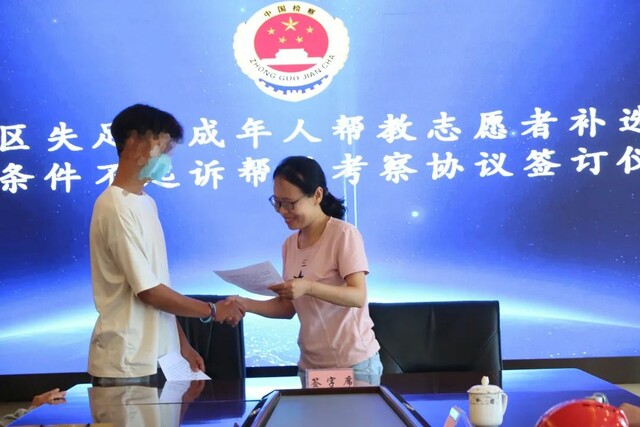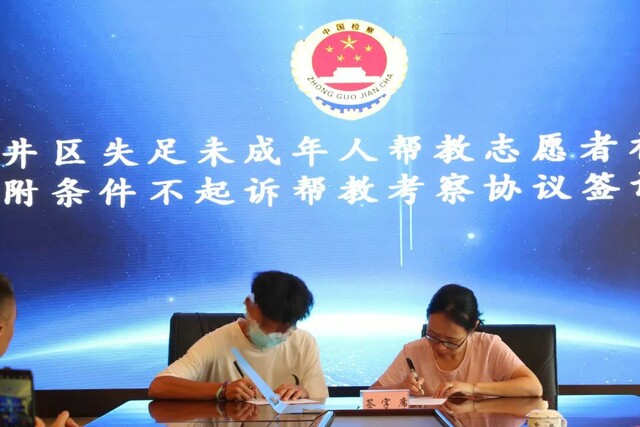 ■ 会后,两名新任志愿者与区检察院两名附条件不起诉未成年人及其监护人签订了附条件不起诉帮教考察协议,第一时间参与到失足未成年人帮教工作中。