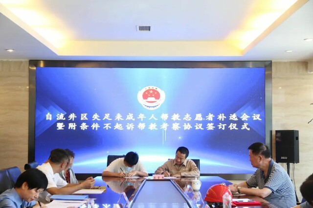 自流井区人民检察院联合区关工委召开自流井区失足未成年人帮教志愿者补选会议并举行附条件不起诉帮教考察协议签订仪式。