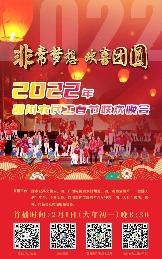 晚会将同步在国家公共文化云、四川观察全矩阵、“智游天府”平台、今日头条、四川农民工服务平台APP和“四川人社”微信、微博等多家新媒体平台首播,2月2日(农历大年初二)在四川广播电视台乡村频道(SCTV—9)22:10重播。