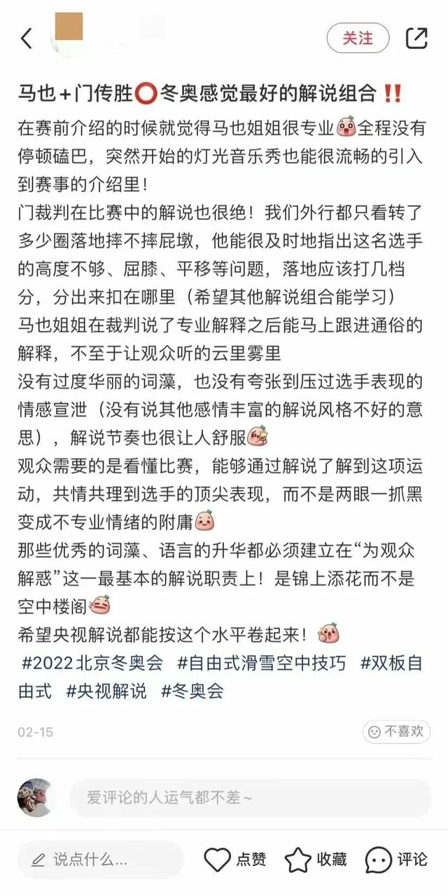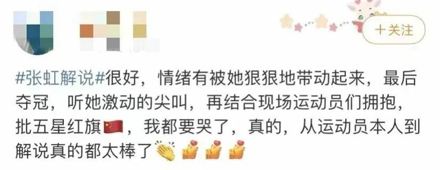 高亭宇赢得北京冬奥会速度滑冰男子500米“飞人大战”。总台解说嘉宾、索契冬奥会速度滑冰女子1000米冠军张虹在解说中难掩激动。赛后她说“我可能不是最完美的解说”,网友却纷纷表白“没有您的专业解说,我其实不懂这项运动的规则;没有您的呐喊,我大概不会热泪盈眶”。