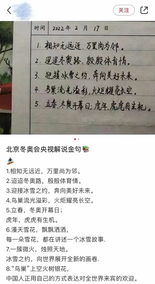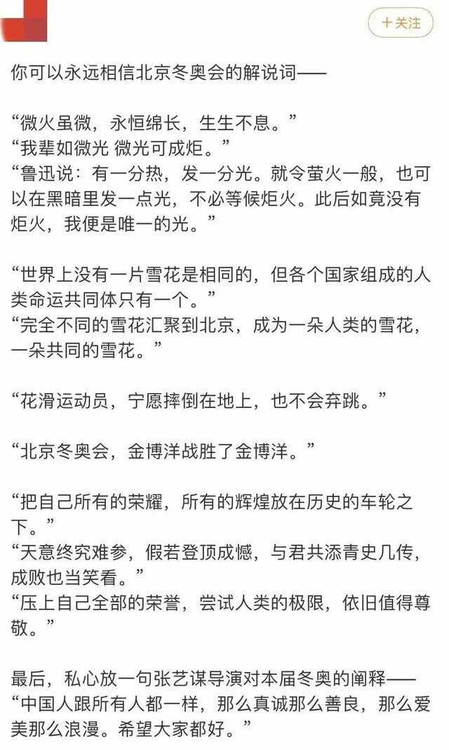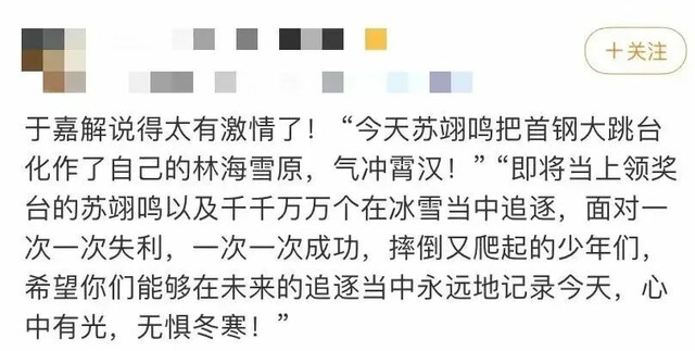 有网友说,“冬奥赛场上,你可以永远相信奋勇拼搏的运动员,也可以永远相信央视的神级解说!堪称大型作文素材输出现场!”花式摘抄,也是广大网友的传统艺能了:
