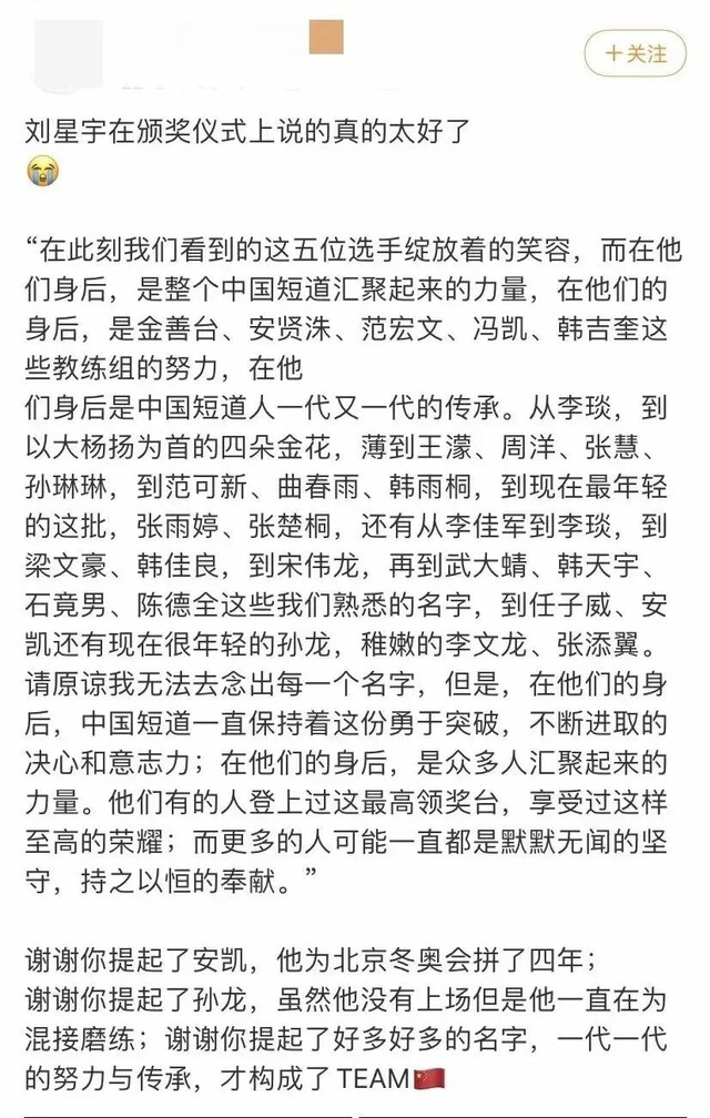 短道速滑混合团体接力刀锋决胜,中国队顶住强大反扑夺得首金。总台解说员刘星宇在颁奖仪式上用一段长长的名单,道出冠军身后,是整个中国短道汇聚起来的力量,是中国短道人一代又一代的传承。网友泪目:“谢谢你提起了好多好多的名字”“这才是Team 🇨🇳啊”!