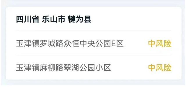截至目前,四川省共有2个中风险地区,为乐山市犍为县玉津镇罗城路众恒中央公园E区、犍为县玉津镇麻柳路翠湖公园小区。其他县(市、区)均为低风险地区。