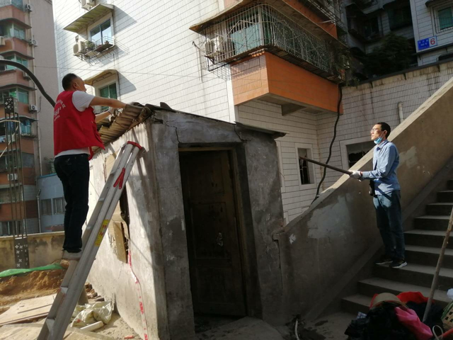 近期,五星街高山井社区接到居民反映,现在处于旧城改造时期,小区内有一处闲置空房内堆积杂物若干,长期无人管理存在异味,能否在此时期帮助整治该处问题。社区接到反映立刻前往现场核实情况,确实发现存在火灾隐患并属于违建,并了解到此处存在危木设计电线隐患。随即高山井社区志愿者同旧城改造人员着手开展整治,将此处树木进行修枝、电线进行重新排线整治、并拆除违建。