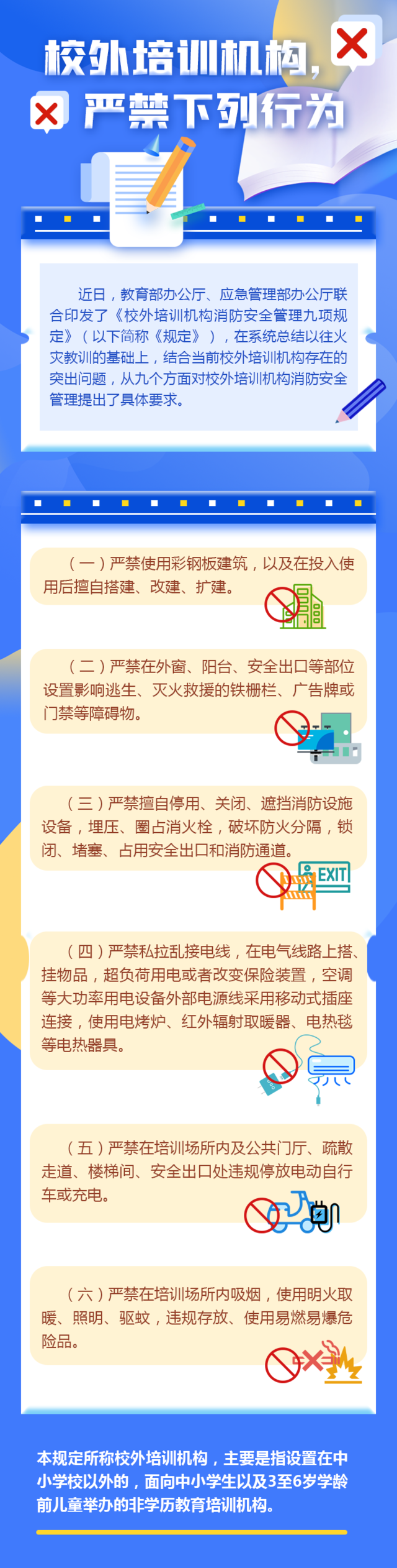 (一)校外培训机构应当遵守国家消防法律法规,执行标准规范。