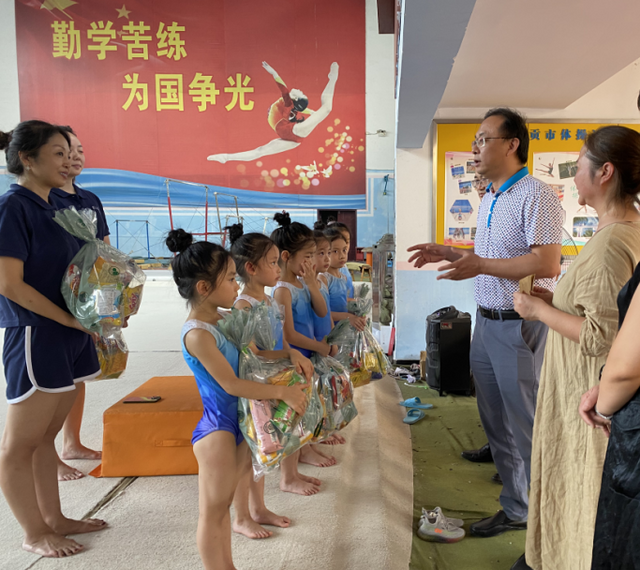 8月1日下午,自流井区副区长贾小龙、自流井区教体局局长吴清毅、副局长余智惠一行顶着炎炎烈日来到檀木林体操馆,慰问即将参加四川省第十四届运动会的檀幼体操健儿,为她们送上关心与祝福,并向幼儿园体操教练致以亲切问候。