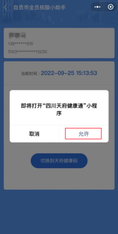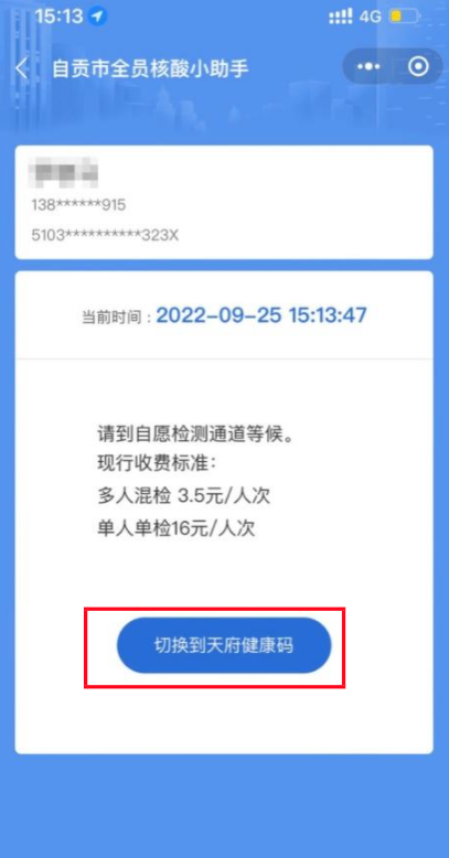 第2步:到达采样人员处,点击【切换到天府健康码】按钮,可直接打开健康码给工作人员进行核酸采集;