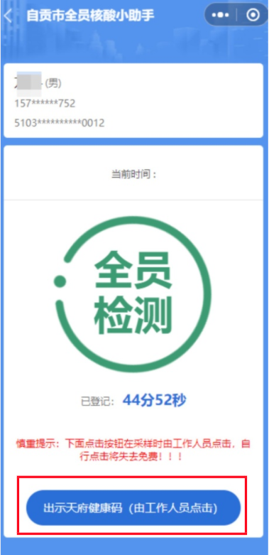 第4步:到达核酸采样人员处,出示【全员检测】动态验证页,经工作人员确认后并点击【出示天府健康码】按钮;
