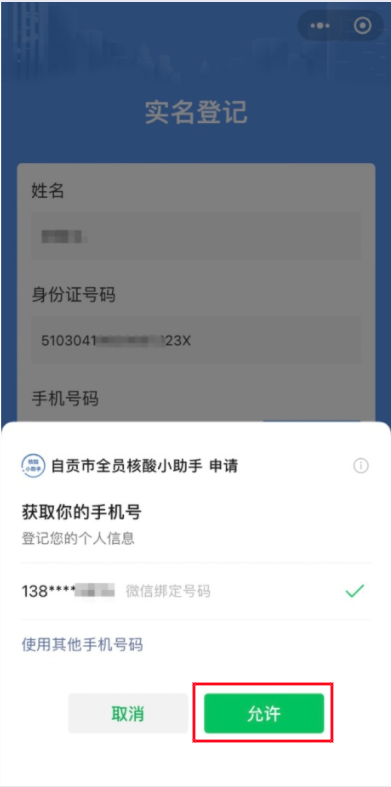 第1步:填写本人姓名、身份证号码、点击【获取手机号码】自动填入微信绑定手机号;
