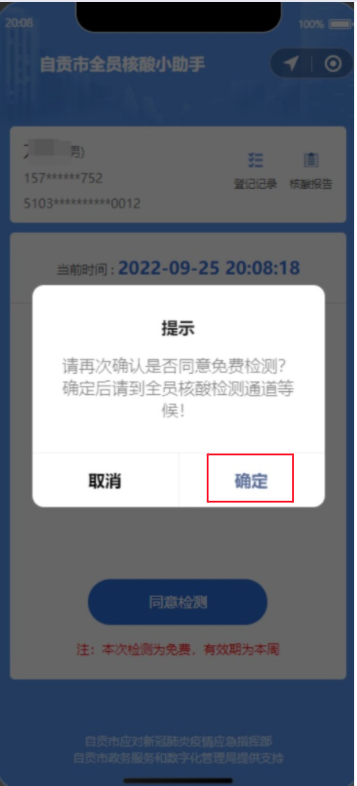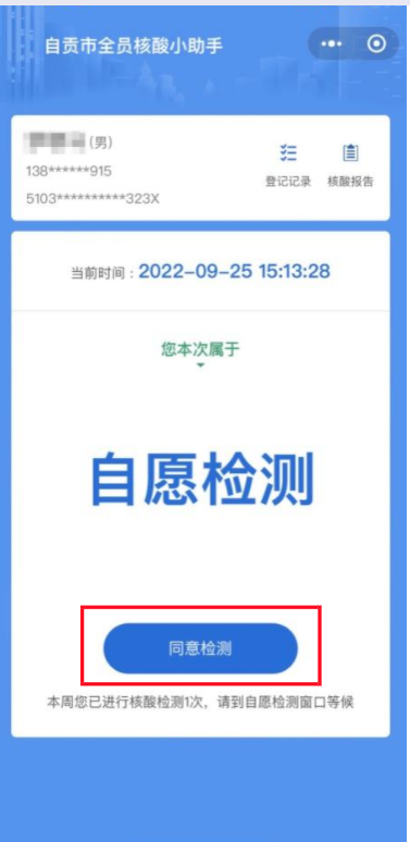 第1步:市民到达核酸采样点现场后,点击【同意检测】,并仔细阅读提示内容;