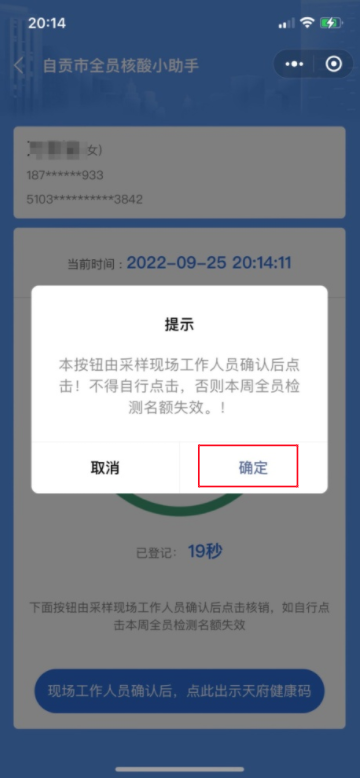 第5步:根据提示窗口点击【确定】,出示天府健康码,扫码即可完成本次核酸采样。