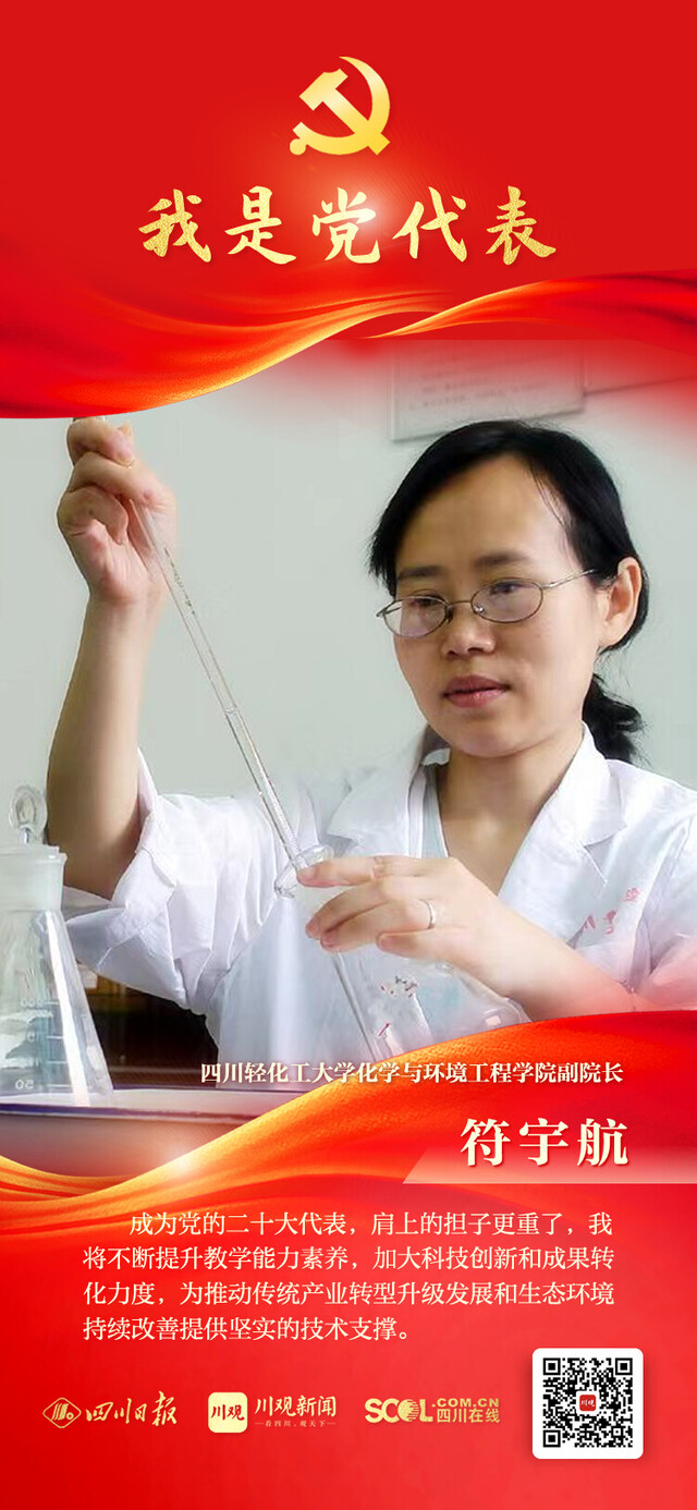 符宇航,四川轻化工大学化学与环境工程学院副院长,教授级高级工程师。曾获全国五一劳动奖章、全国优秀科技工作者、四川省优秀共产党员、四川省青年科技奖等荣誉,并当选四川省第十一次、十二次党代会代表,十三届全国人大代表。