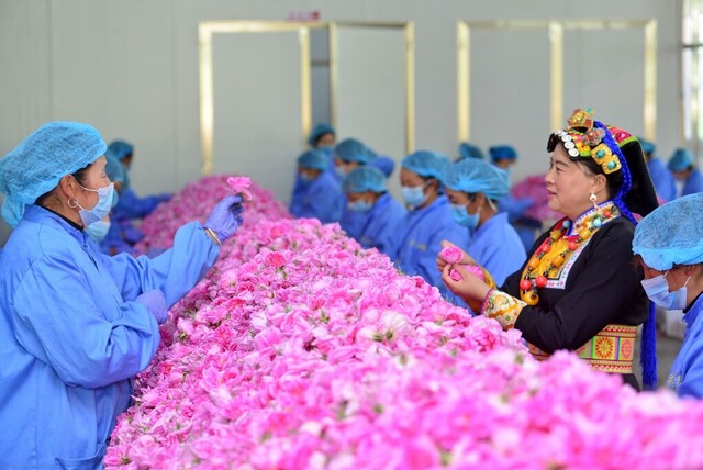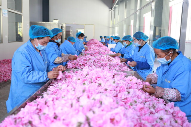 小金玫瑰加工车间,工人们在精选玫瑰花。资料图 小金县委宣传部提供