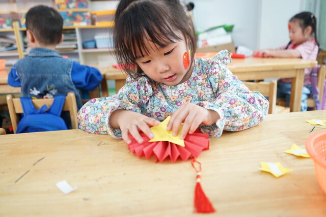 幼儿活动同样精彩纷呈:小班级幼儿用手指印画在纸杯上创作,为祖国妈妈制作立体生日蛋糕,表达祝福与热爱之情;中班级幼儿利用落叶制作了一幅巨大的“中国地图”,借此了解中国的地大物博,体会身在中国的幸福感;大班级幼儿进行手工活动——国旗手表,戴在手腕,每一分、每一秒我们都与五星红旗同在!家长们也积极参与到国庆活动中,分享幼儿和国旗在一起的照片、共同制作礼物献给祖国妈妈。