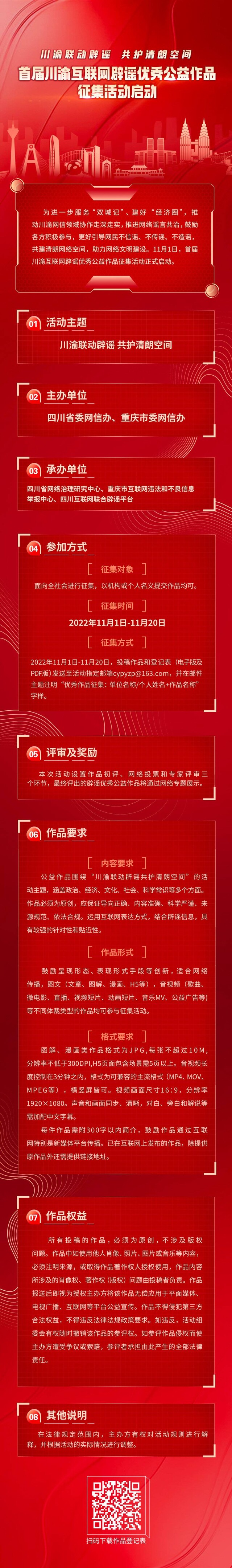 为进一步服务“双城记”、建好“经济圈”,推动川渝网信领域协作走深走实,推进网络谣言共治,鼓励各方积极参与,更好引导网民不信谣、不传谣、不造谣,共建清朗网络空间,助力网络文明建设。11月1日,首届川渝互联网辟谣优秀公益作品征集活动正式启动。