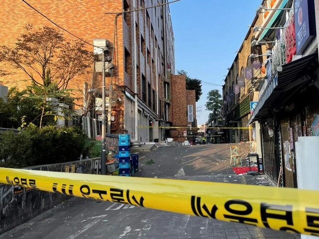 在韩国首尔市龙山区梨泰院洞一带,踩踏事故现场已被警方封锁。记者张悦 摄
