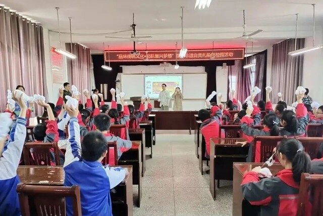 ●近日,我区开展“品味传统文化 启航复兴梦想”国家级非遗自贡扎染进校园活动。通过邀请专家详细讲解自贡扎染的基本知识,现场示范捆扎法、打结法、云撮法等基础手法,零距离感受扎染艺术的魅力,弘扬传统文化。